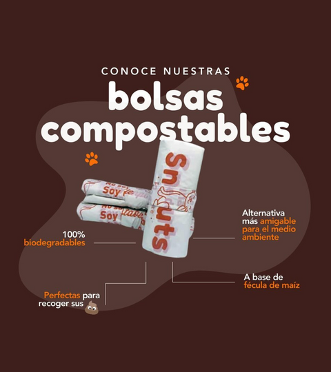 Bolsas 100% compostables para mascotas. Elaboradas con almidón de maíz y aceites vegetales biodegradables. Ideales para recoger los desechos de tus mascotas y ayudar al medio ambiente.