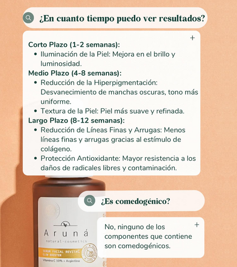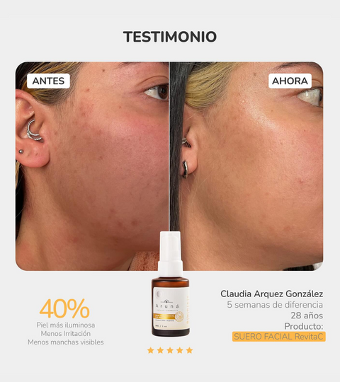 El Suero Facial RevitaC de Aruná es una fórmula avanzada de vitamina C encapsulada y potenciada con lúcuma como activo principal. Aporta beneficios antioxidantes ofreciendo una solución completa para mejorar la salud de la piel opaca, con manchas y sin brillo. Mejora notablemente la apariencia de la piel, proporcionando beneficios antioxidantes, hidratando y combatiendo los signos del envejecimiento. Previene y reduce la inflamación de la piel en condiciones de acné, ayudando a que las piel tengan un proceso de cicatrización mínimamente visible ¡Excelentes beneficios en un solo producto!