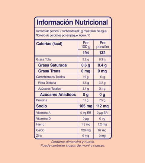 Harina de almendra, harina de avena, clara de huevo en polvo, banano liofilizado, leudante, canela en polvo, sal marina, sabor natural a vainilla, estevia y ucho amor.