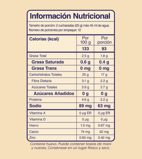 Harina de avena, banano liofilizado, huevo entero en polvo, clara de huevo en polvo, leudante, estevia, sal marina y mucho amor.
