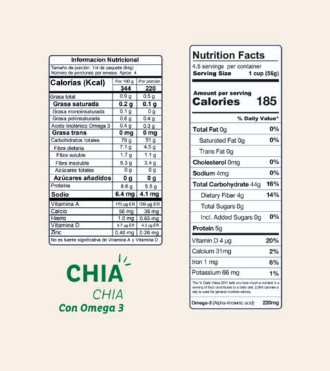 Harina de maíz, harina de arroz, y harina de chía.