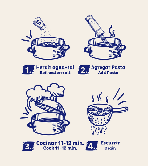✸ Cocción: Por cada 100 gramos de pasta, hervir en una olla honda 2 litros de agua y 10 gramos de sal.