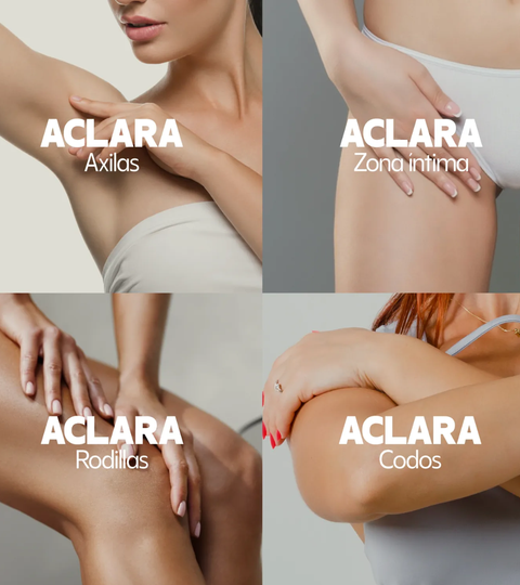 Esta diseñado para aclarar y unificar el tono de la piel en zonas delicadas como la zona íntima, axilas, entre muslos, cuello o codos.