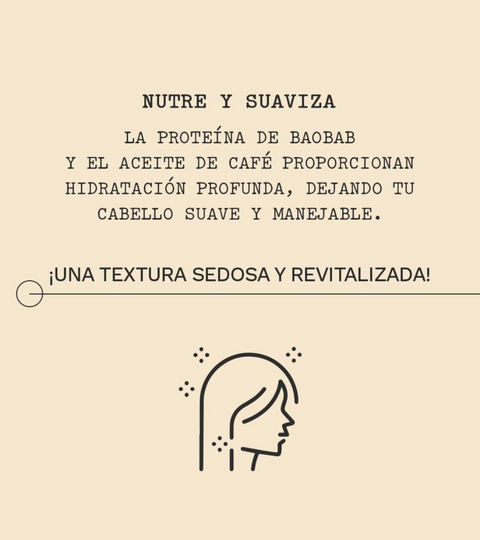 Ayuda a proteger el color, revitalizar y nutrir el cabello, aportando mayor peinabilidad y movimiento. Contiene aminoácidos de origen vegetal, aceite de café y proteína de Baobab.