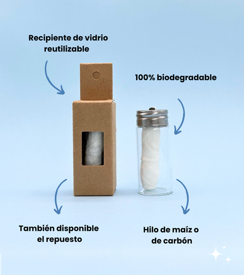 Este hilo dental natural es elaborado con bioplástico de fibra de carbón vegetal. Viene empacado en un pequeño recipiente de vidrio reutilizable con un dispensador que te permite cortar el hilo en el tamaño que desees.