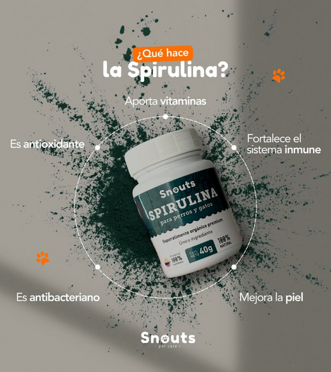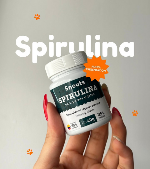 40 gr. La espirulina es ampliamente reconocida como un superalimento y muy recomendada para agregarla a la dieta diaria de tu mascota con el objetivo de mejorar la salud y el bienestar en general de tu mascota. La razón de esto es la excelente fuente de proteínas, vitaminas B y ácidos grasos esenciales que estimulan el sistema inmunológico de su mascota.