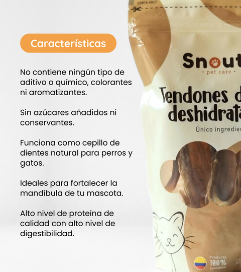 Snack natural hecho de Tendones de Res deshidratados. Bocado crujiente y resistente para tener distraída a su mascota por un periodo de tiempo más prolongado, usado también como cepillo de dientes natural gracias a la acción de roer que provoca en su mascota.