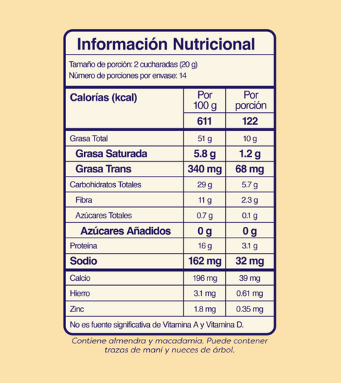 Almendras, avellanas, alulosa, cacao en polvo, estevia, sal marina, sabor natural a vainilla, y mucho amor.