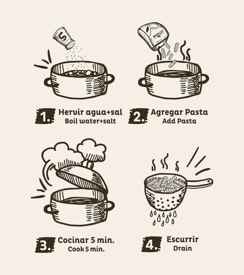 ✸ Cocción: Por cada 100 gramos de pasta, hervir en una olla honda 2 litros de agua y 10 gramos de sal.