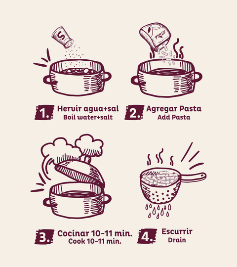 ✸ Cocción: Por cada 100 gramos de pasta, hervir en una olla honda 2 litros de agua y 10 gramos de sal.