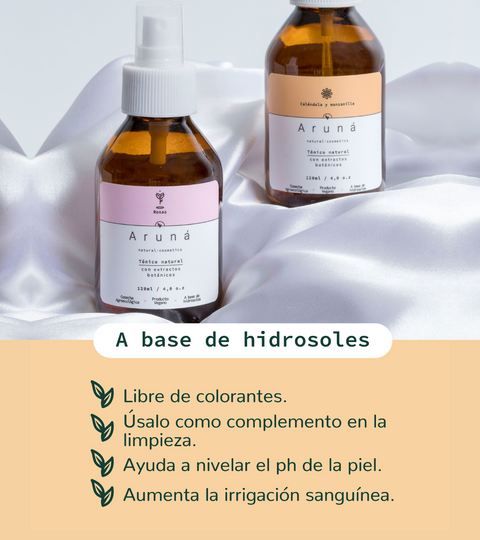 Tónico facial eco-natural elaborado a base de hidrosoles libre de alcohol y colorantes artificiales. Da balance a los niveles de pH de la piel, remueve el exceso de grasa y brillo, refina y unifica el tono de piel, reduce el enrojecimiento y la irritación y repara la piel para recibir un tratamiento posterior. Los hidrosoles o hidrolatos son aguas florales que se obtienen por medio de la destilación de la planta.